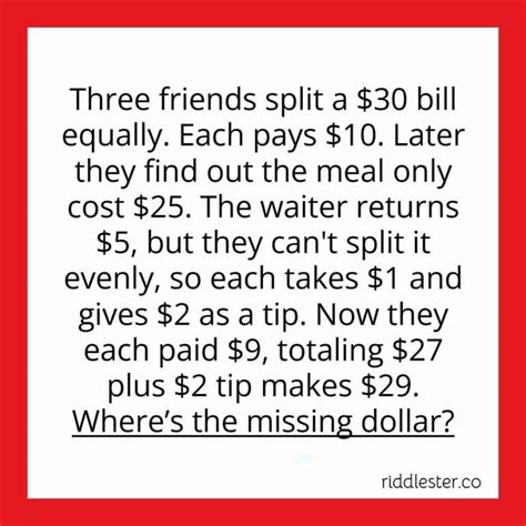 Have you ever heard of the missing dollar riddle? It is a simple but mind-bending puzzle that has been around for ages, and it still stumps people to this day. The goal of the riddle is to figure out how three people can split a dollar, with each one of them ending up with a dollar.